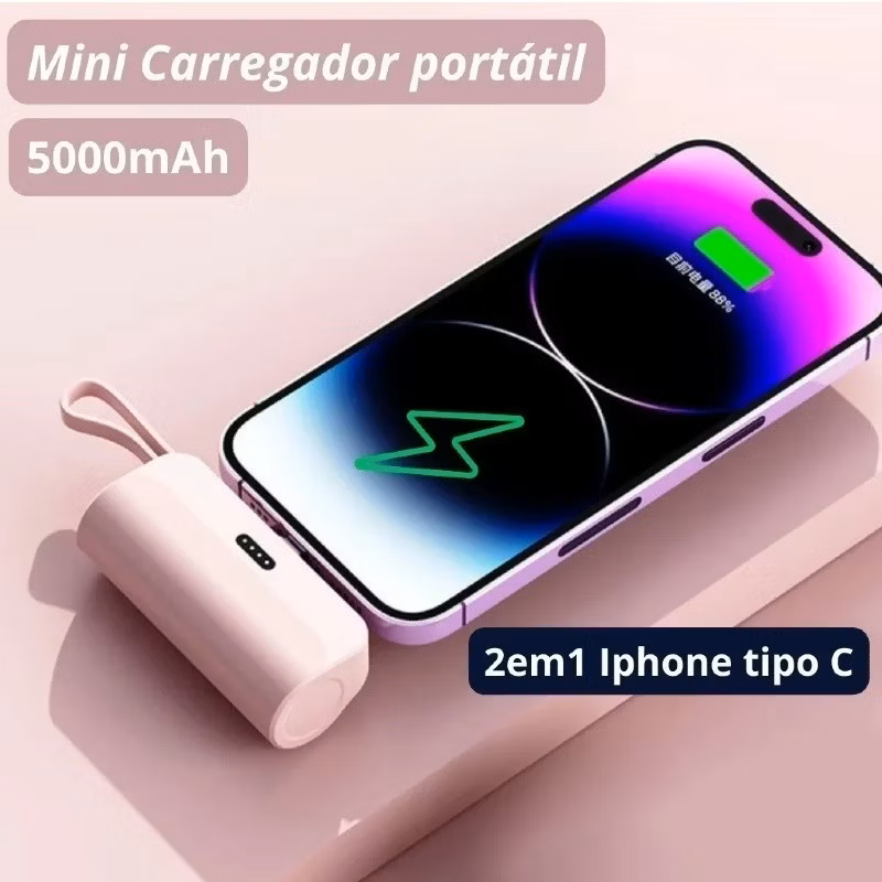 Tenha energia sempre à mão com o Mini Carregador Portátil 2 em 1, a solução perfeita para quem precisa de praticidade no dia a dia. Compatível com iPhones e celulares com entrada Tipo-C, ele é ideal para manter seus dispositivos carregados em qualquer lugar.
